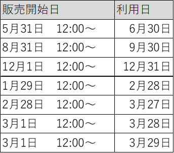 ※対応した日付がない場合は、1ヶ月前の翌日を過ぎた最初の日の12:00に販売開始いたします。
